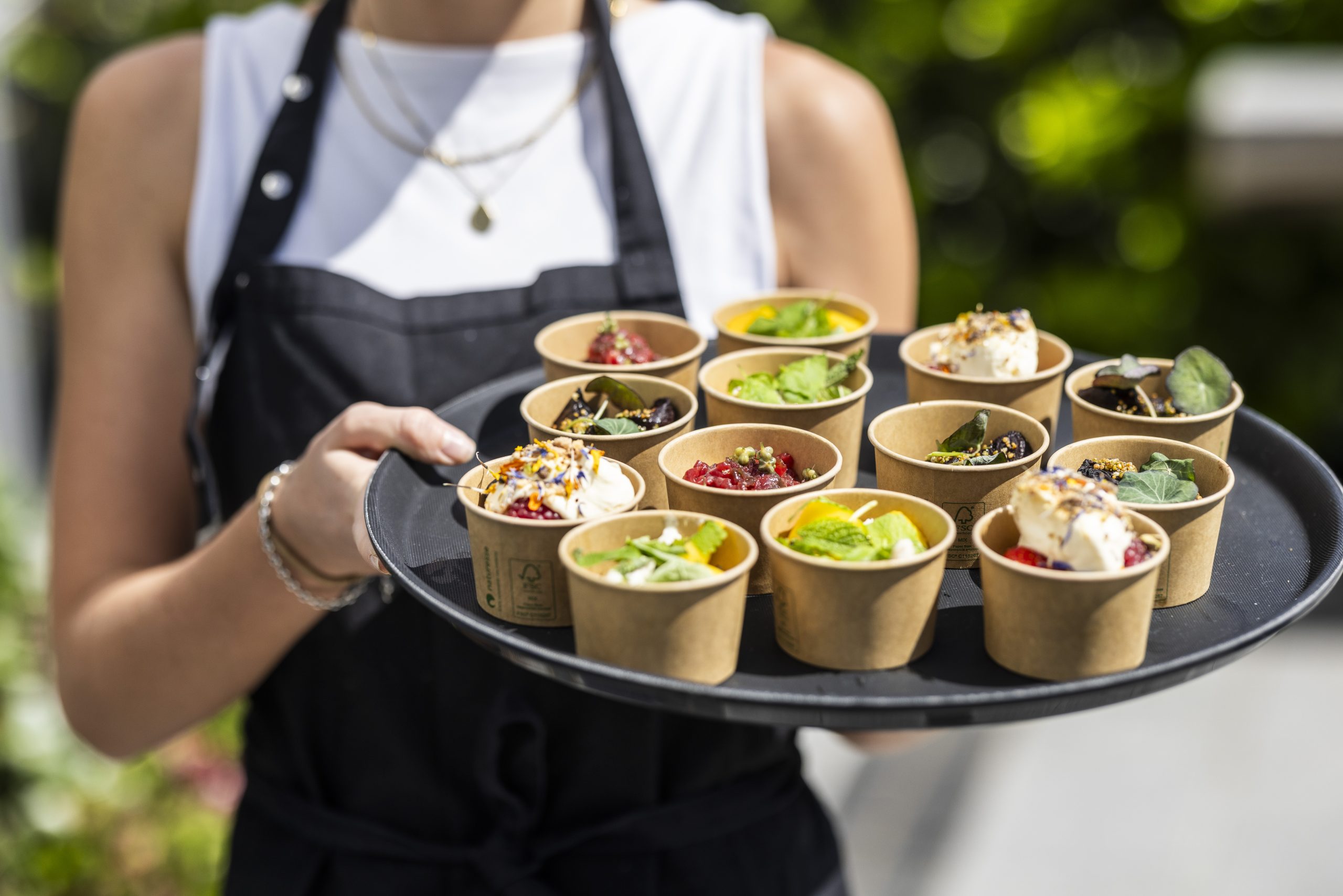 Maden er udviklet specifikt til stående servering. Elegant anrettet, nem at håndtere og skabt til at understøtte samtaler og flow i rummet.